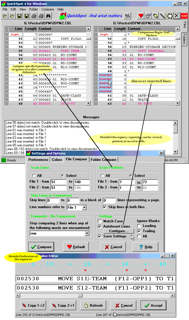 - Download reports from a mainframe to a Windows ASCII-Files and compare them with QuickSpot. QuickSpot's in-built capability to skip a number of lines on every page (defined as report-headers) and to focus the compare across certain positions per line only makes it truly unique. It's a low-cost alternative for comparison of parallel test-results.